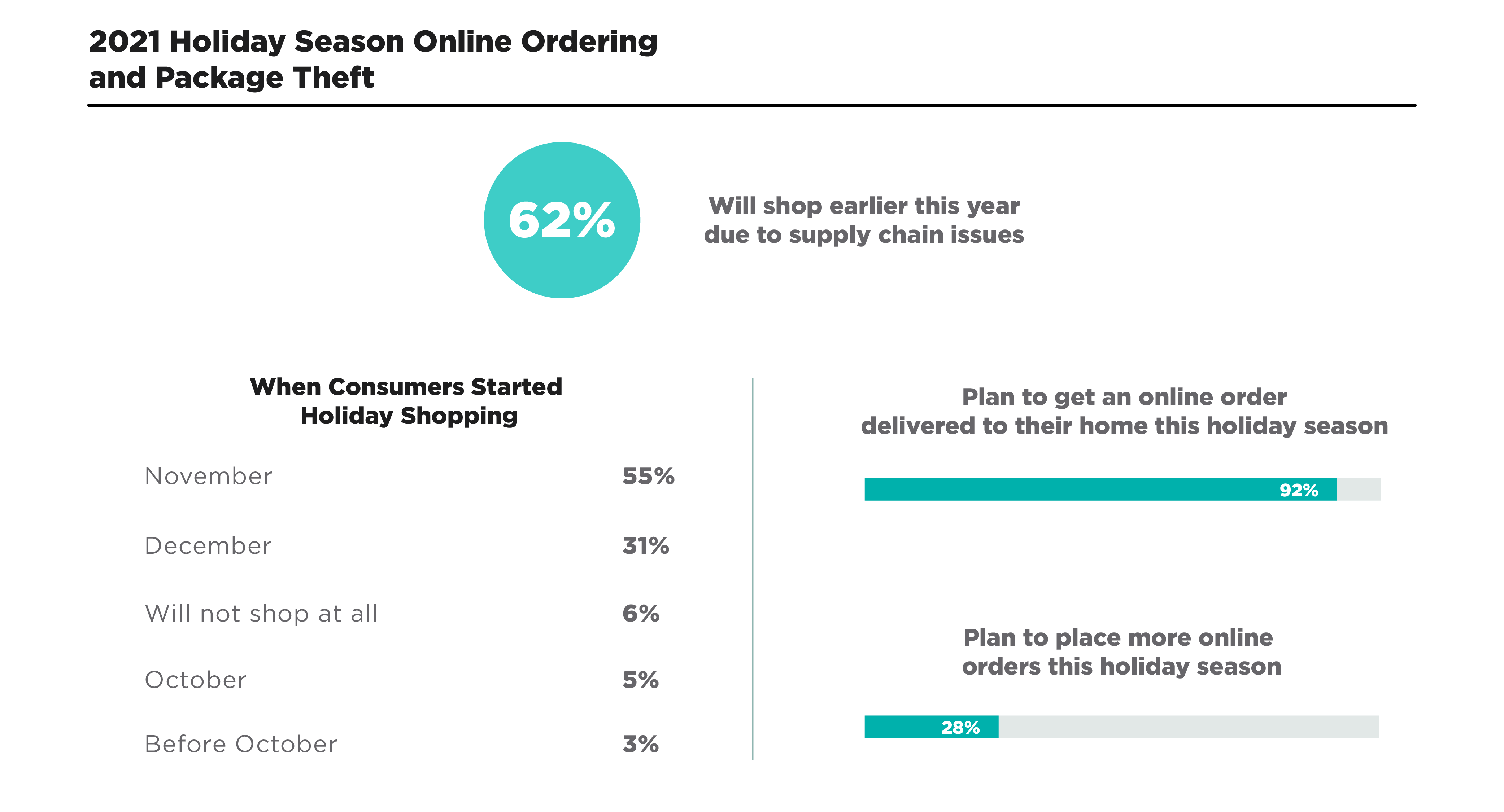 Overall, consumers plan on increasing the amount of online shopping they do in 2021. Specifically, over one quarter (28%) said they plan on placing more online orders this holiday season. More online orders mean more deliveries, forcing many consumers to face the reality of potential package theft.