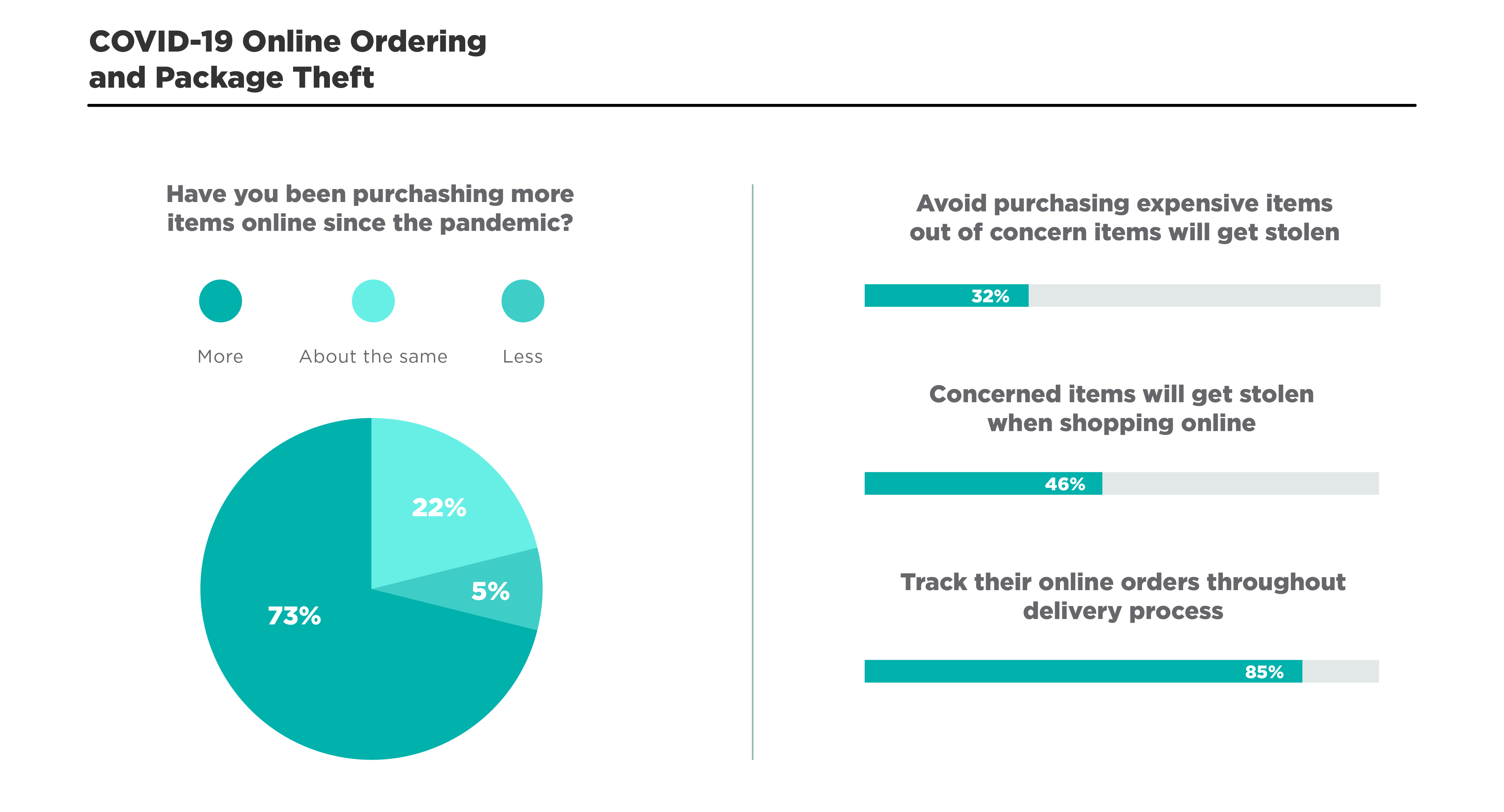 We found almost half (46%) of respondents are concerned about the eventual theft of their online purchases, while approximately one-third (32%) go so far as to avoid ordering expensive items online out of fear that those deliveries will eventually be stolen.