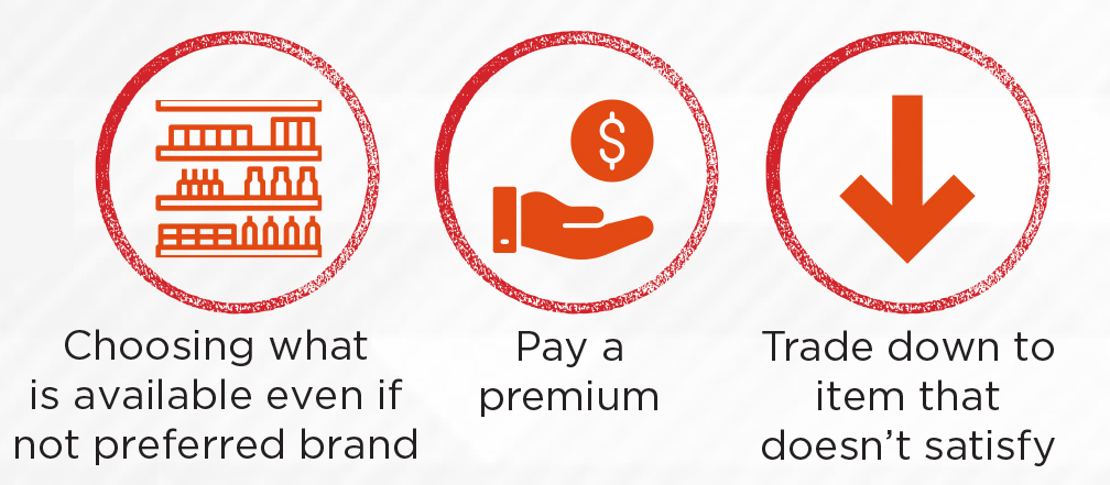 3. Brand selection for many items is down to what’s available in many categories. Consumers are choosing what’s available vs. their preferred brand, especially in necessity categories (e.g., milk, eggs, fresh meat, paper products). This may lead them to pay a premium or trade down a purchase an item that doesn’t satisfy. And it does not necessarily equate to a new loyal customer, yet.