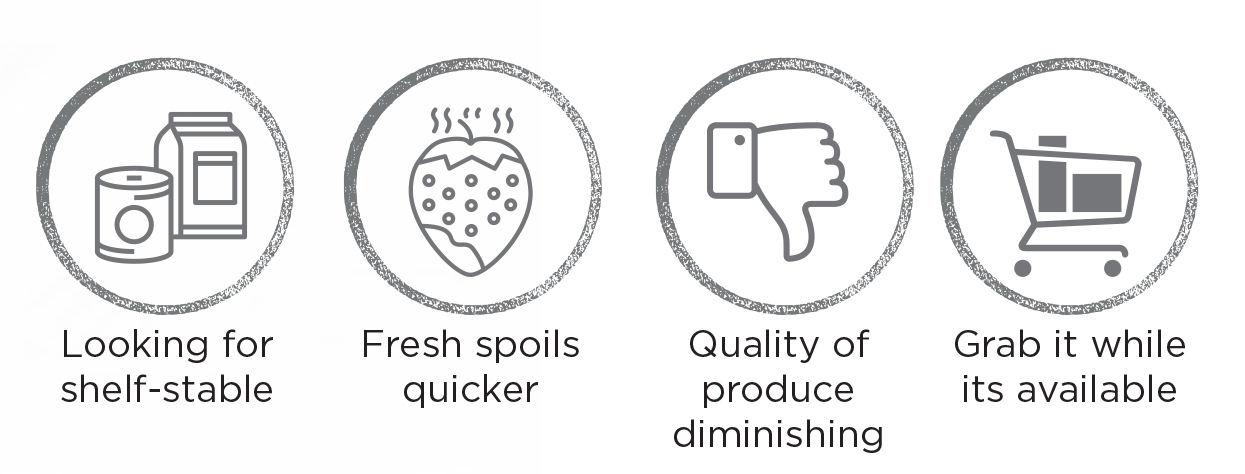 5. Many are switching to more shelf-stable items to stockpile and help limit the need to shop often. Again, consumers are trying to visit stores less often than what they used to do. Fresh spoils more quickly – so then they have to go back to the store sooner. Some are also noticing the quality of produce diminishing in their preferred grocery store because they are ordering from different vendors; some are also being limited on the amount of fresh meats, produce or dairy they can purchase. So they are looking for shelf-stable alternatives in the center aisle as a replacement that keeps them from coming to the store too often and to keep things on hand to be prepared for future out-of-stocks.