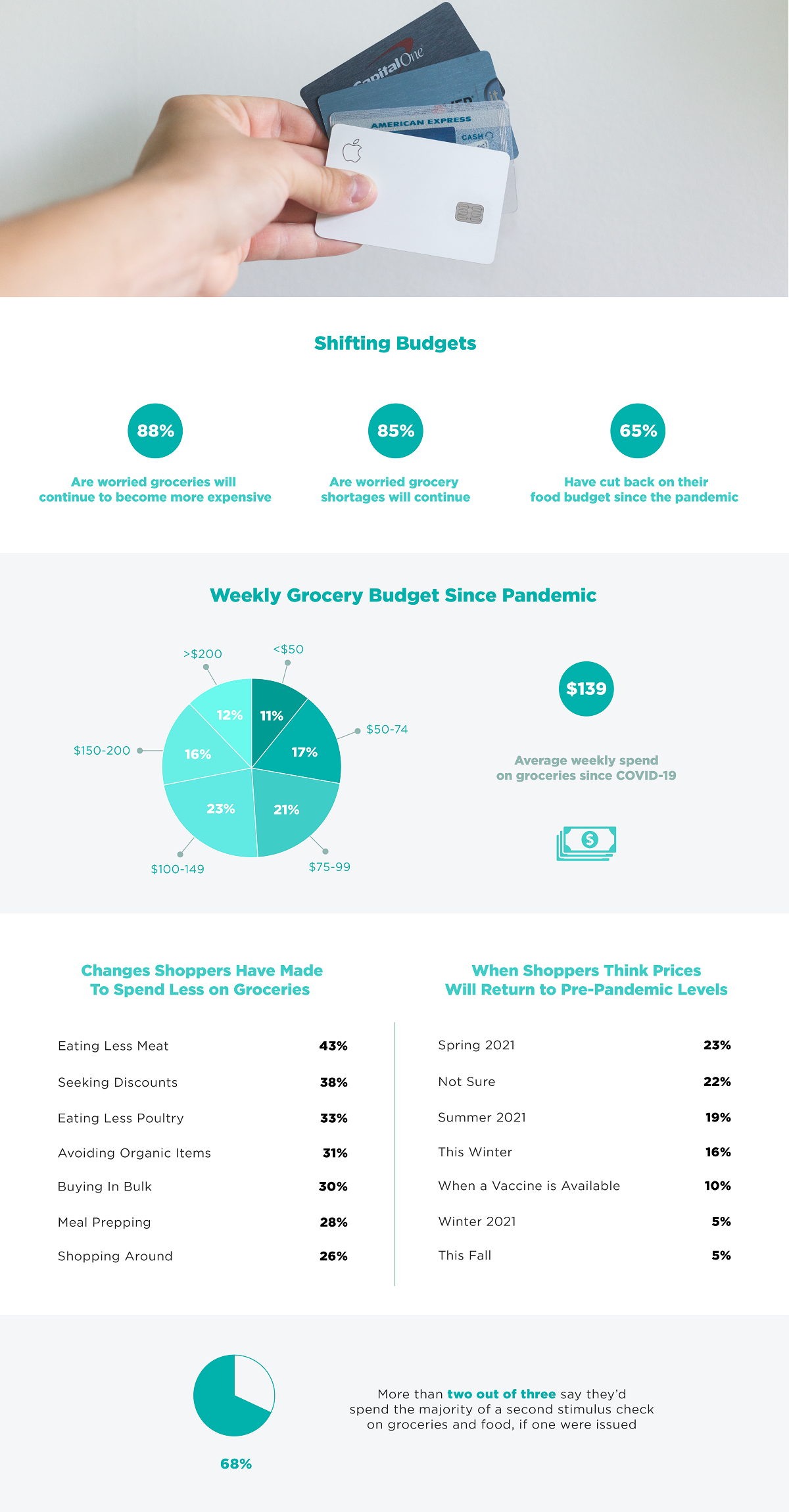 As consumers continue to navigate the uncertainties of COVID-19, about two-thirds (65%) say they’ve been cutting back on their food budget. On average, consumers say they’re spending $139 per week on groceries and the vast majority (88%) are concerned that grocery prices will continue to rise rather than level out or decrease. Along with cutting back on their budgets, consumers are making other changes to their shopping habits such as eating less meat, seeking discounts, eating less poultry, and avoiding organic items, which tend to be more expensive.