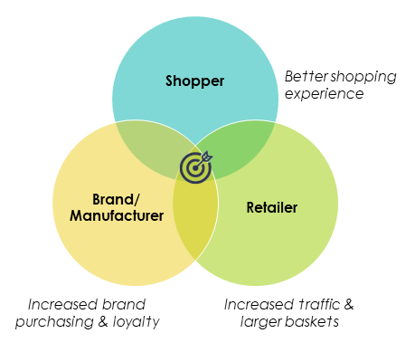 The Win/Win/Win solution balances the needs of the three key parties: the retailer, the manufacturer, and the shopper. The solutions are intuitive to the shopper, increase brand sales for the manufacturer, and maximize category sales for retailers.