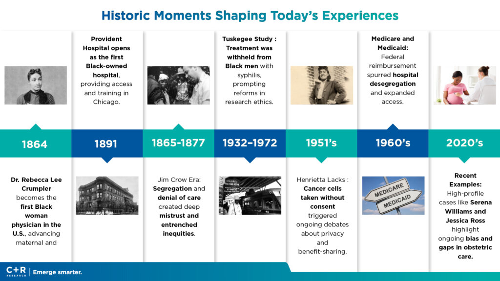 This month, we’re partnering across C+R’s Multicultural and Healthcare specialties to spotlight an issue drawing intensified national attention: healthcare experiences in the Black/African American community. From rising premiums and coverage churn to widely shared patient stories—like recent incidents where Mercedes Wells and Kiara Jones, Black mothers in active labor, were delayed or turned away, resulting in dangerous births outside of proper care —these are not isolated events or “new” phenomena. They’re the latest chapters in a long, intergenerational history of mistrust, unequal treatment, and structural barriers that continue to shape how Black/AA consumers engage with the U.S. health system today.