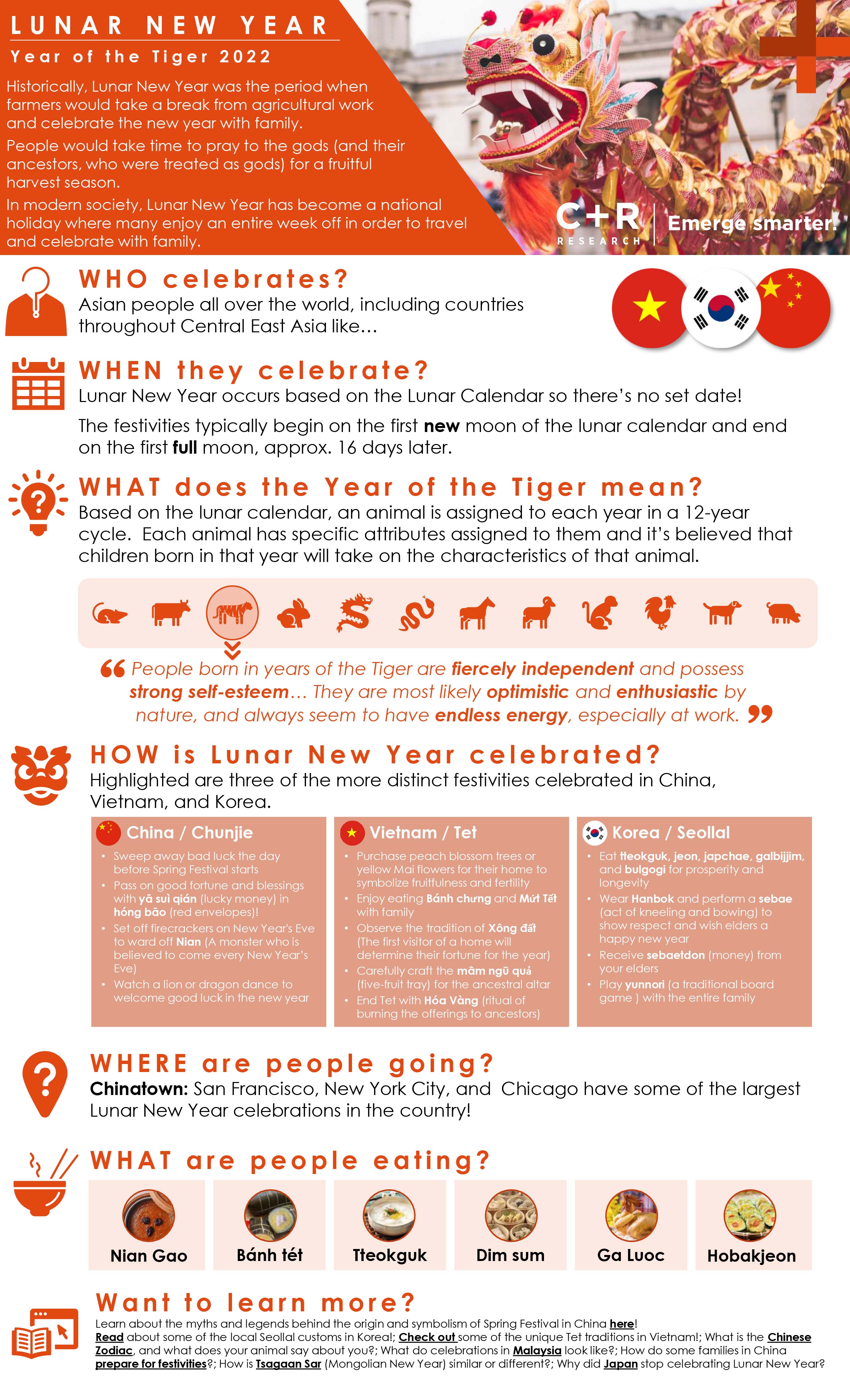 It’s 2022, and the Year of the Tiger. This year, Lunar New Year began on February 1st, and the celebration continues for 15 days. This is one of the most significant celebrations in Asian culture. In honor of this celebration that is part of the rich Asian culture, C+R’s CultureBeat team is sharing this infographic and short video to encourage continuous education about different cultural groups. We’ll check in with you again on January 22, 2023, when we celebrate the Year of the Rabbit. Enjoy!