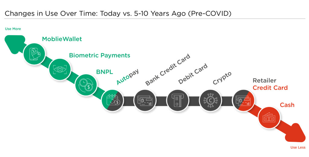 Long-standing go-to payment methods have seen consistent use over time. Autopay Subscriptions, Bank Credit Cards, and Debit Cards continue to deliver on shoppers’ need for ease and convenience, as they are still some of the most widely accepted payment types.