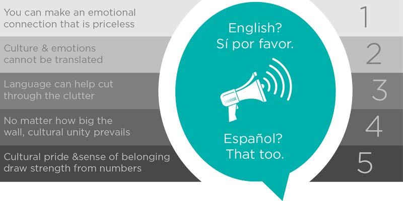 4.No matter how big the wall, cultural unity prevails.You’ve heard about Trump’s wall, right? While we don’t endorse illegal immigration, we are realistic and know that what drives Hispanics to leave their homes is the search for a brighter future. Regardless of walls, Hispanics will continue to come into this country. Sure, maybe it won’t be in large waves, but the flow will continue. In fact, Reuters reports a rush on migration along the U.S.-Mexico border as a result of the ongoing anti-immigration narrative. The ongoing immigration of U.S. Hispanics will likely yield a new wave of consumers that are still culturally and emotionally attached to their roots, and language plays a pivotal role in keeping them connected to their cultural DNA.