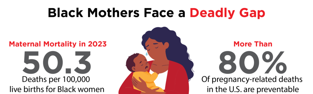 The crisis in maternal health outcomes for Black/American women warrants urgent attention. In 2023, the CDC reported the maternal mortality rate for Black/African American women at 50.3 deaths per 100,000 live births, significantly higher than rates for their non-Hispanic White (14.5), Hispanic (12.4), or Asian (10.7) counterparts. Even more alarming, the CDC estimates that more than 80% of all pregnancy-related deaths in the U.S. are considered preventable. And, while many deaths happen in the hospital during delivery, well over half of all pregnancy-related deaths occur during postpartum, a period marked by both emotional and physical vulnerability for women.