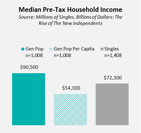 But, consider that a majority of gen pop households include two earners (upwards of 60% according to Pew). Households of one do not, so on per capita basis The New Independents are actually earning more – significantly more – than married people.