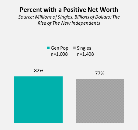 This higher per capita income, however, does not necessarily translate to a positive net worth. Indeed, gen pop households were significantly more likely than singles to report a positive net worth.
