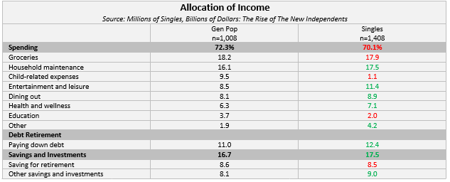 While singles are certainly spending more on entertainment and leisure, health and wellness, and dining out, overall they tend to spend a lower share of their income compared to married people. This is in large part due to the absence of child-related expenses.