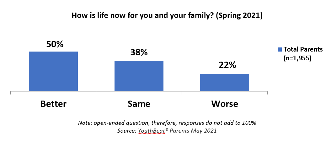 Youth are back at it! Summer camps, family reunions, traveling cross country, and sleepovers with their friends top the list of plans young people have for the summer. COVID-19 restrictions have been lifted in most areas, and kids welcome a return to their sports leagues, showing their animals at the county fair, and visiting water parks. Half of parents say life is getting better.* YouthBeat® parents shared that good things are happening, life is returning to normal, and they’re looking forward to seeing friends and family members they’ve missed throughout the pandemic.