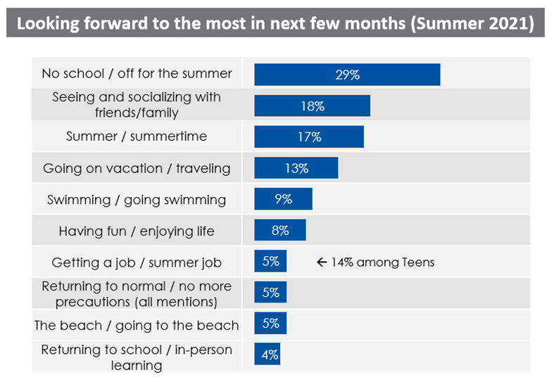Youth agree with parents when we talked to them in the Spring, as 18% happily anticipate seeing their friends and family in the next few months.** More than anything, kids are ready to take a well-deserved break from school, with 29% reporting they’re eager for school to be out for the summer.** Evergreen warm-weather activities like swimming, going on vacation and hitting up the beach endure as Gen Alpha makes time-honored childhood memories.